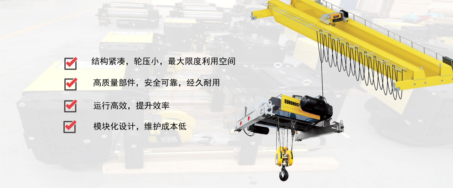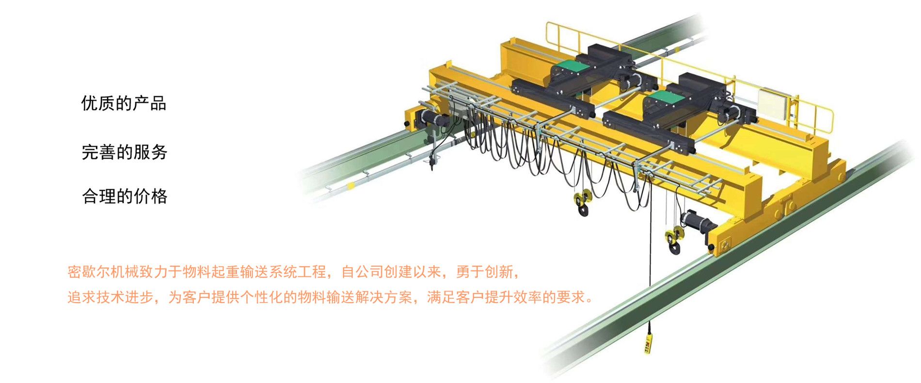 密歇爾起重機(jī)械(杭州)有限公司提供全面的起重輸送產(chǎn)品和服務(wù),產(chǎn)品覆蓋環(huán)鏈電動葫蘆(125Kg-80T),歐式鋼絲繩葫蘆,防爆葫蘆,懸臂吊,KBK柔性起重機(jī),歐式起重機(jī),起重馬達(dá),端梁,起重移動供電系統(tǒng)等,在國內(nèi)外被廣泛的應(yīng)用于生產(chǎn)車間,汽車,模具,機(jī)械制造,鐵路,船舶,物流搬運,現(xiàn)代化工廠流水線等工業(yè)及其它特殊用途。